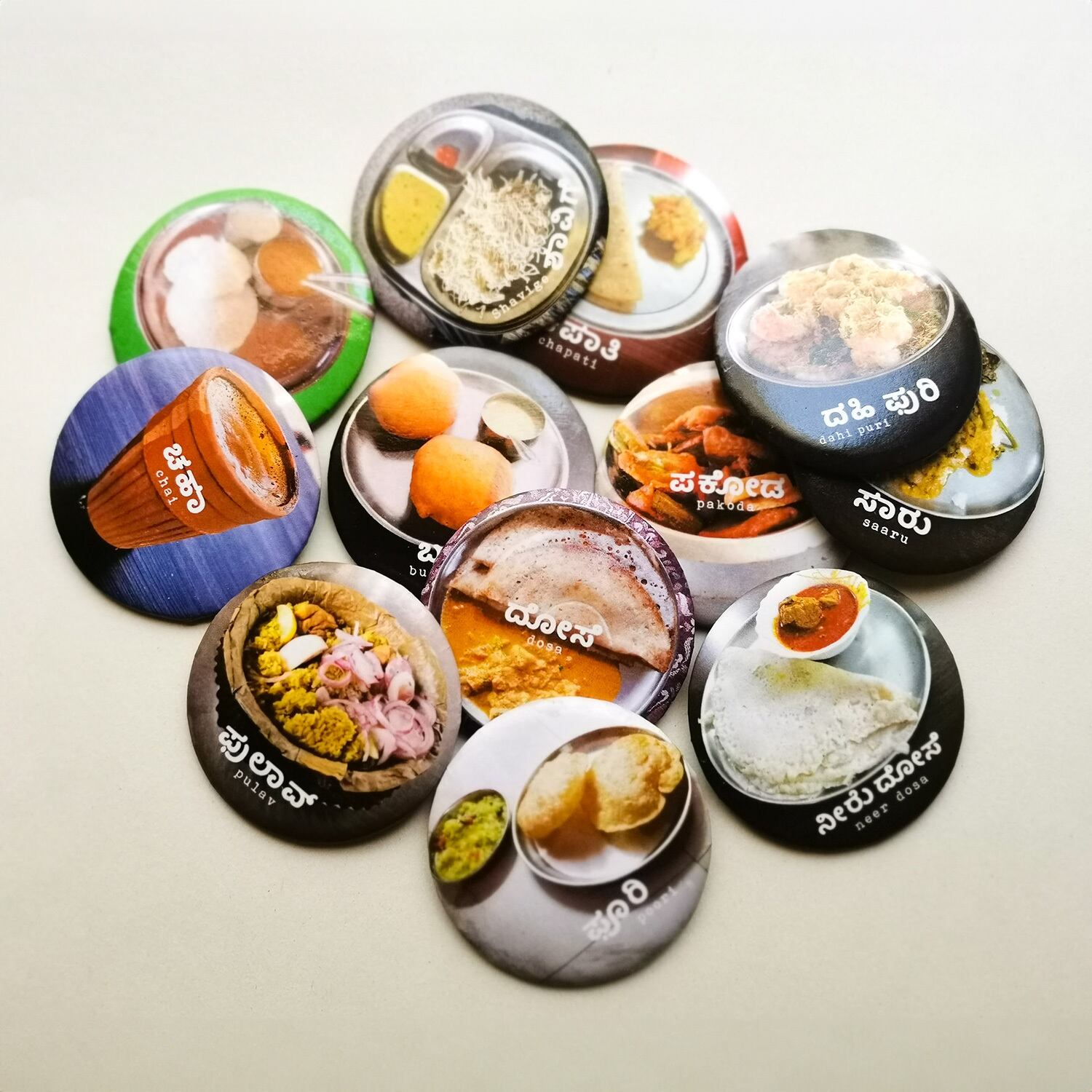 南インドの街なかや家庭で出会った、忘れ得ぬ料理たちを缶バッジにしました。料理名はカンナダ語と英語でポップに併記。通常のクリアフィルムではなく、一枚一枚刷毛でニスを塗っているため、紙の質感と工芸感が高まっております。おなかが空いたときは、バッジを見ながら空腹に耐えられます。散歩や買い物、旅のお供にぜひ連れて行ってください。